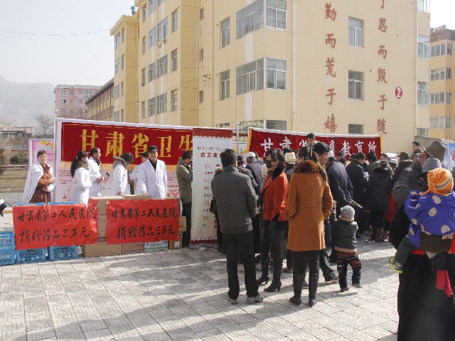 2月28日,根据省卫生厅的安排,在省卫生厅党组书记、副厅长李存文的带领下,省二院院长米登海、副院长张灏与儿科、妇科、中医科专家一行12人赴甘南州夏河县,参加由省委宣传部牵头,文化、科技、卫生等14个省直部门共同组织的2013年甘肃省文化科技卫生“三下乡”集中示范活动,并为藏族群众现场义诊,捐赠了价值3万元的药品。