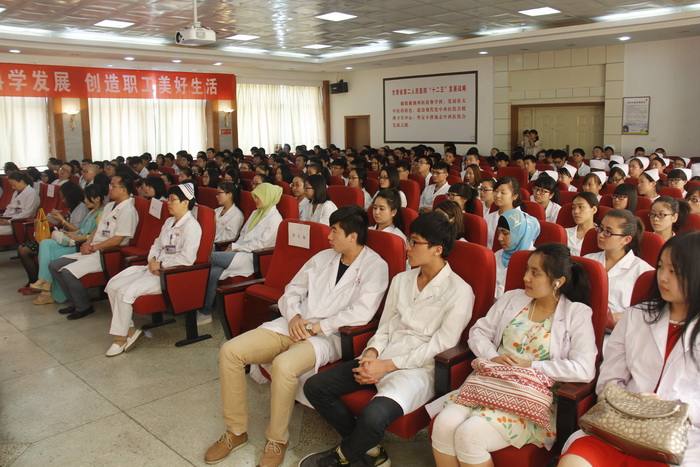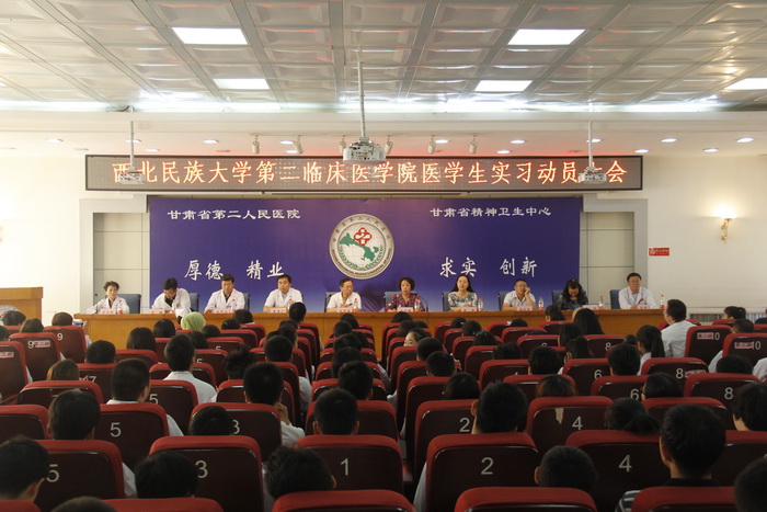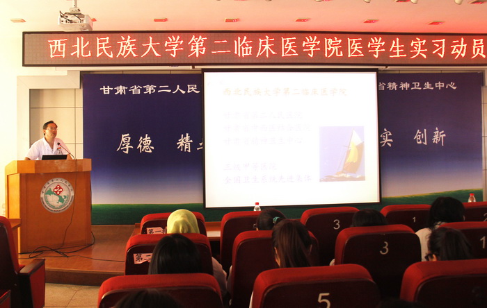 6月8日上午,西北民族大学第二临床医学院医学生实习动员大会在甘肃省第二人民医院举行,出席本次大会的有西北民族大学医学院书记吴彩梅、院长赵晋、副书记张纬、副院长海向军,甘肃省第二人民医院、西北民族大学第二临床医学院院长米登海,党委书记夏彦广,纪委书记张军玉,副院长张灏、张锦华。会议由金永新副院长主持。各相关办公室工作人员、老师代表及2011级临床和2012级护理专业200多名实习学生参加了本次大会。
