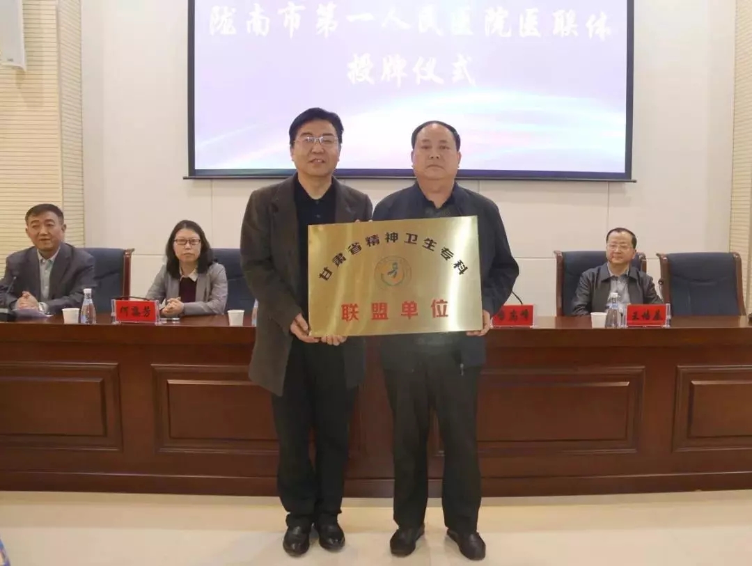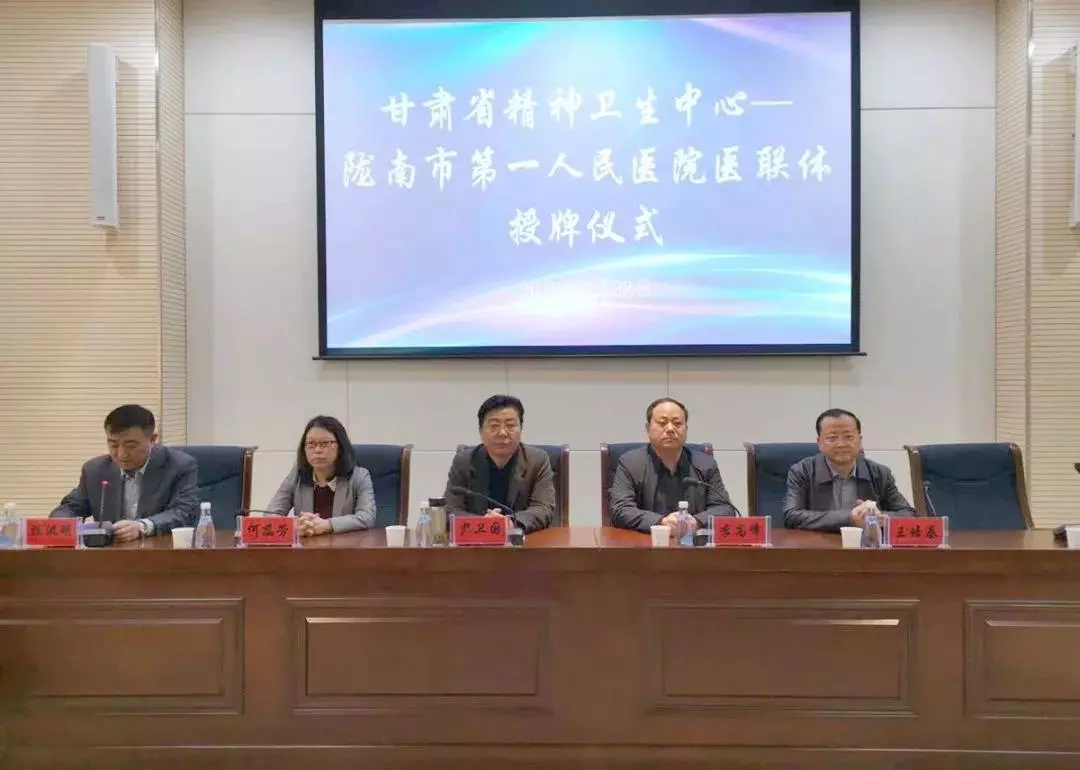 仪式上,李高峰书记致辞;尹卫国书记代表甘肃省精神卫生中心授予陇南市第一人民医院“甘肃省精神卫生专科·联盟单位”牌;副院长何蕊芳和李高峰书记分别代表双方单位签订了精神卫生医联体协议。